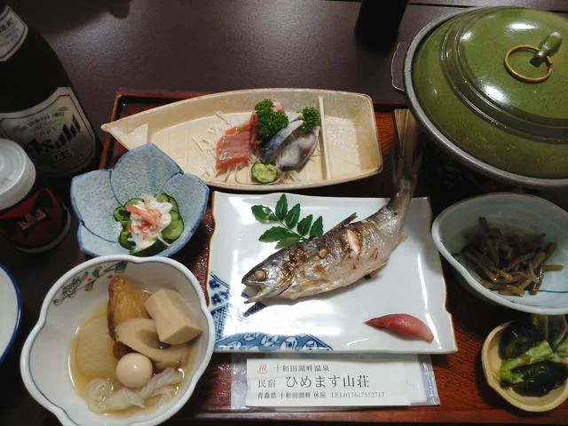 十和田湖の絶景を眺めながら食事ができます。ひめますの塩焼きは新鮮で美味しく、地元の味が堪能できました。