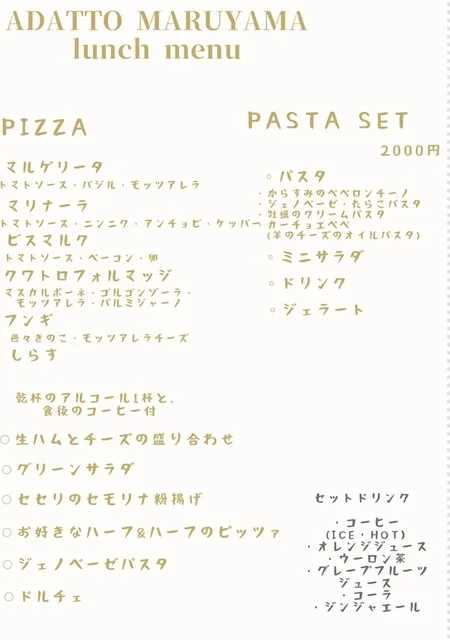 アダット マルヤマ イタリアン・ピッツァ 札幌円山公園 📞 電話で予約 🌐 ネット予約 📍 地図を見る 📤 シェア 3.8 ⭐⭐⭐⭐ 125件のレビュー 料理 サービス 雰囲気 コスパ 🕐 営業時間・定休日 ランチ 水・金・土・日・祝 12:00-14:30(L.O. 14:00) ディ... -