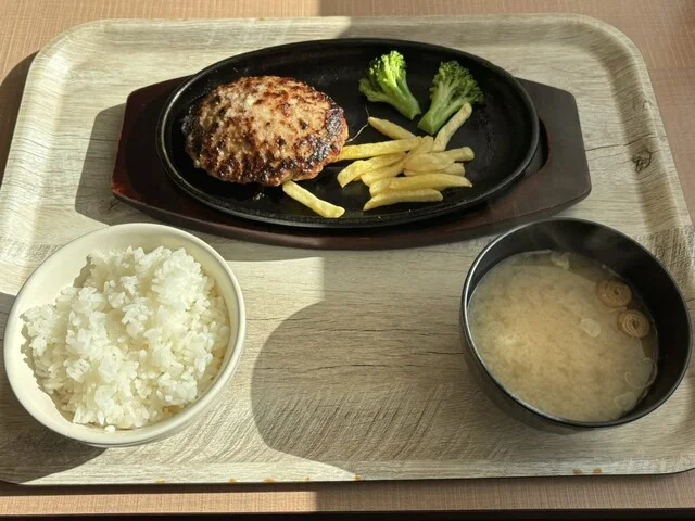 ハンバーグは肉厚でジューシーです。ソースの味わいが良く、ご飯との相性も抜群。値段も手頃で家族連れに最適。