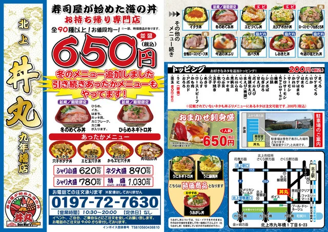 岩手県北上市の中心部に位置する『丼丸 北上 九年橋店』は、鮮度抜群の海鮮丼と季節ごとの特選メニューが自慢の和食店です。10:30〜20:00年中無休で、ランチ・ディナーともに利用しやすく、予約受付も朝9時から可能。店内は清潔感のあるカウンター席が中心で、海の恵みを存分に味わえる空間を提供しています。価格はやや高めながらも、素材の質とサービスの丁寧さでリピーターが続出。駅近でアクセス便利な立地と、現在開催中の季節限定メニューや割引キャンペーンで、初めての来店でも満足できる食体験が期待できます。