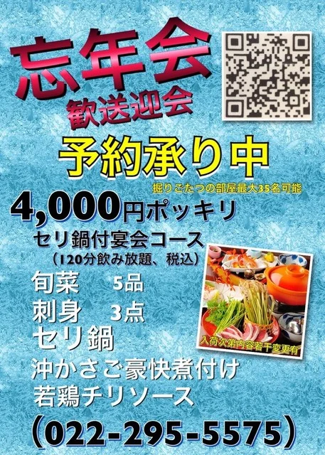 月~木は夜23:30まで、金土は深夜1:00まで営業しており、様々なシーン対応が可能です。ランチ営業(11:30~14:30)も実施しているため、仕事帰りの飲み会から昼間の食事まで幅広く利用できます。宮城野区の中心地にあり、アクセスも良好で会社員や出張客の利用に適しています。